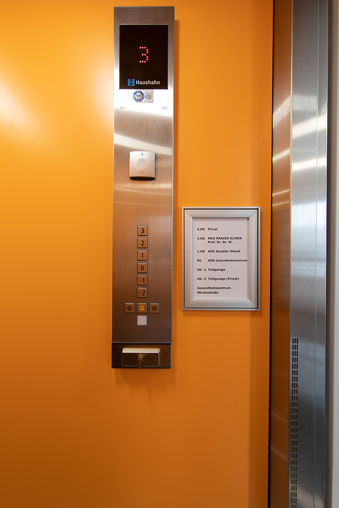 Die etwa 30 Mitarbeiter und Bewohner sowie die Besucher des Hauses treten in eine geräumige, gemäß DIN EN 81-70 behindertengerechte Kabine, die eine Spiegelrückwand zusätzlich optisch vergrößert. Bauprojekta konzipierte die Aufzugsgröße für den Transport von Krankenliegen, da früh die Raumnutzung durch Krankenkasse und Arztpraxen feststand. Ein warmes Orange in der Ausstattung Santa Cruz taucht die Kabine in ein angenehm beruhigendes Licht. Darin fahren auch die Bewohner der Penthousewohnungen per separater Fahrberechtigung sicher und komfortabel zwischen der zweigeschossigen Tiefgarage und den obersten Stockwerken. Mit der Penthousesteuerung schalten sie den Aufzug für ihre Gäste frei, die dann ebenfalls direkt in ihrer Wohnung aussteigen können.