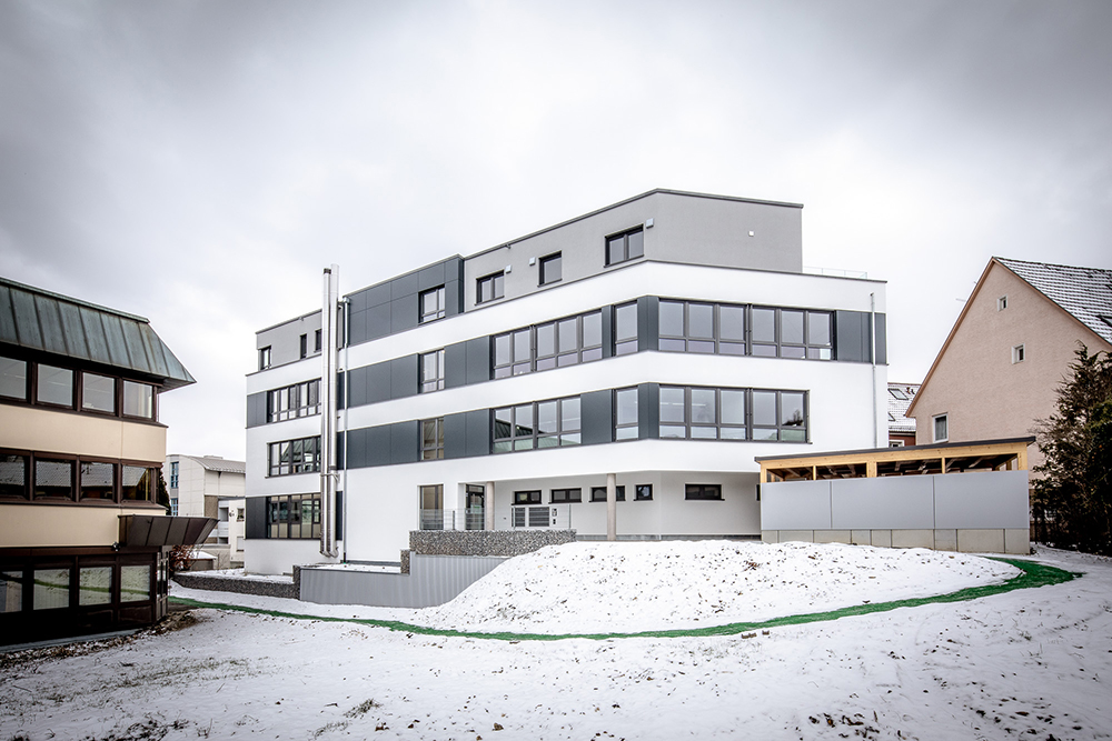 Das Gebäude in der Mörikestraße wirkt mit seinen umlaufenden Fensterfronten, die viel Sonnenlicht in die Wohn- und Gewerberäume lassen, offen und hell. „Funktionale und großzügige Grundrisse schaffen hier eine freundliche Atmosphäre“, erklärt Geschäftsführer Eberhart. „Bei Material und Ausstattung haben wir besonderen Wert auf Qualität und akkurate Verarbeitung gelegt. Der Haushahn lifeLine passt gut in dieses Konzept.“