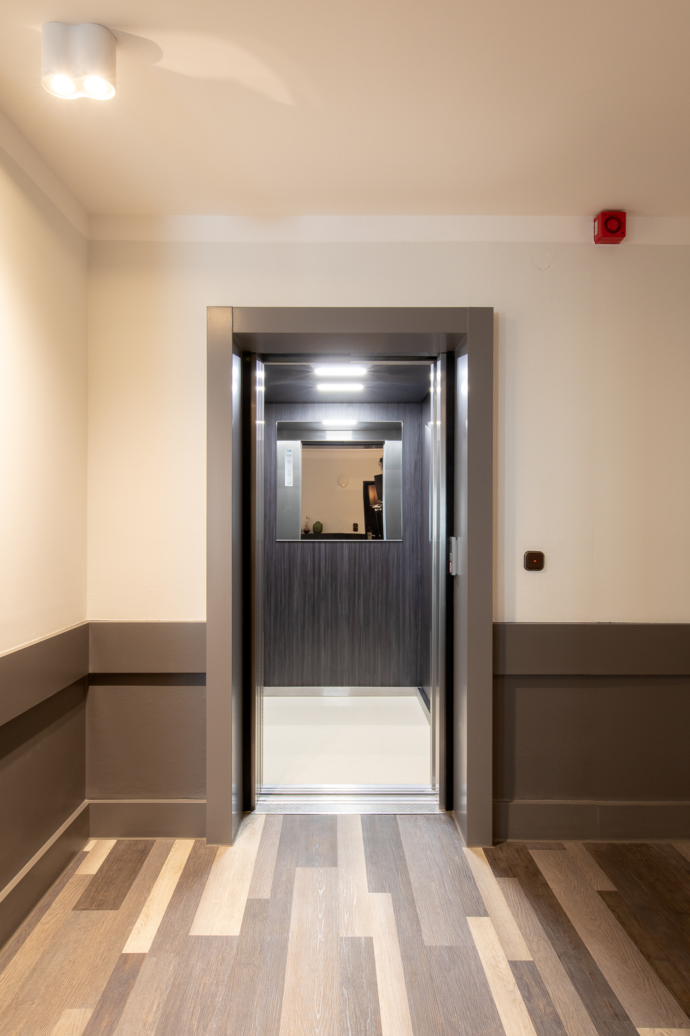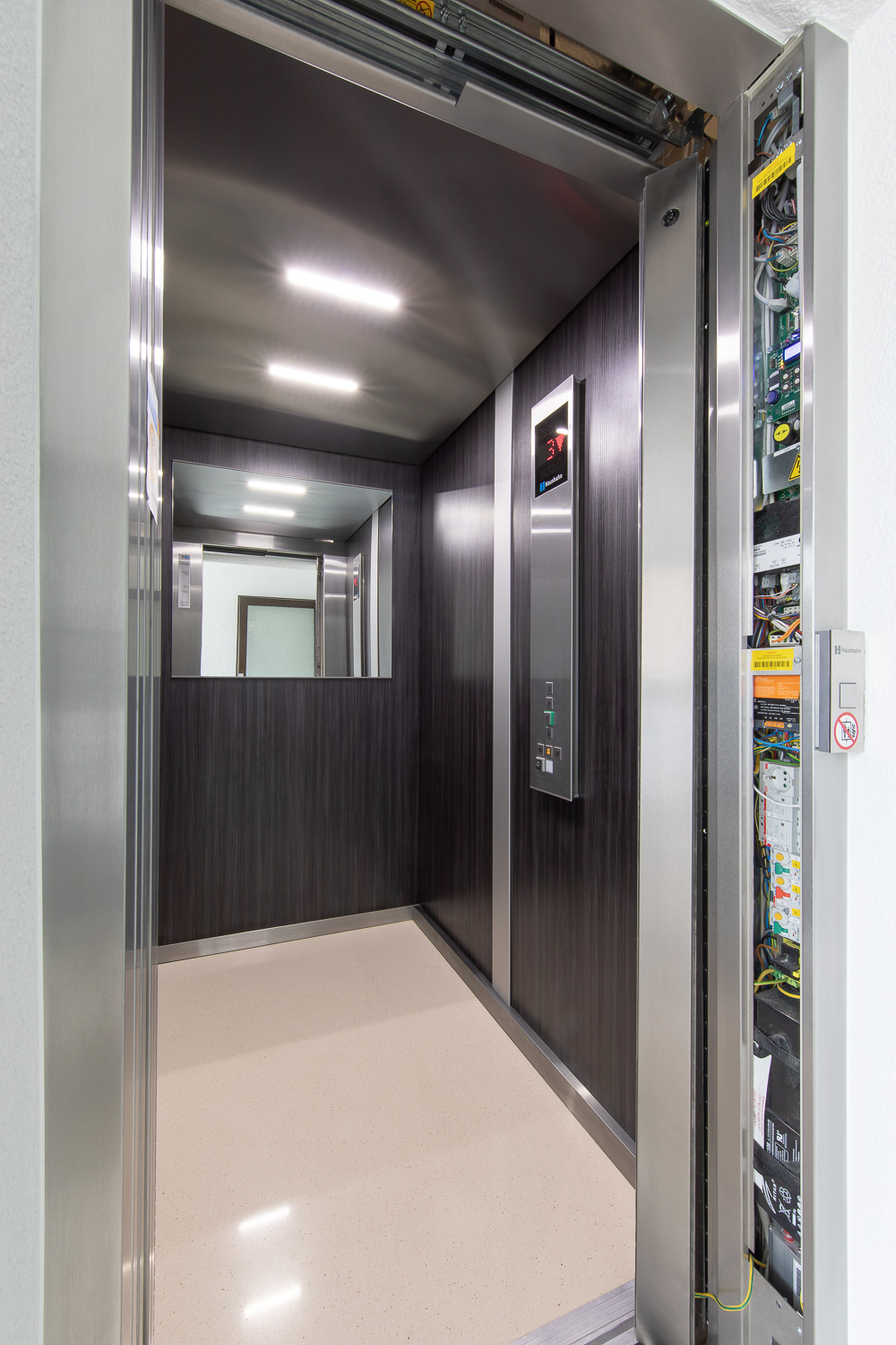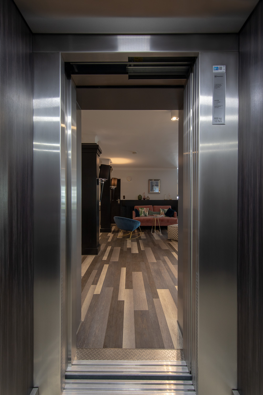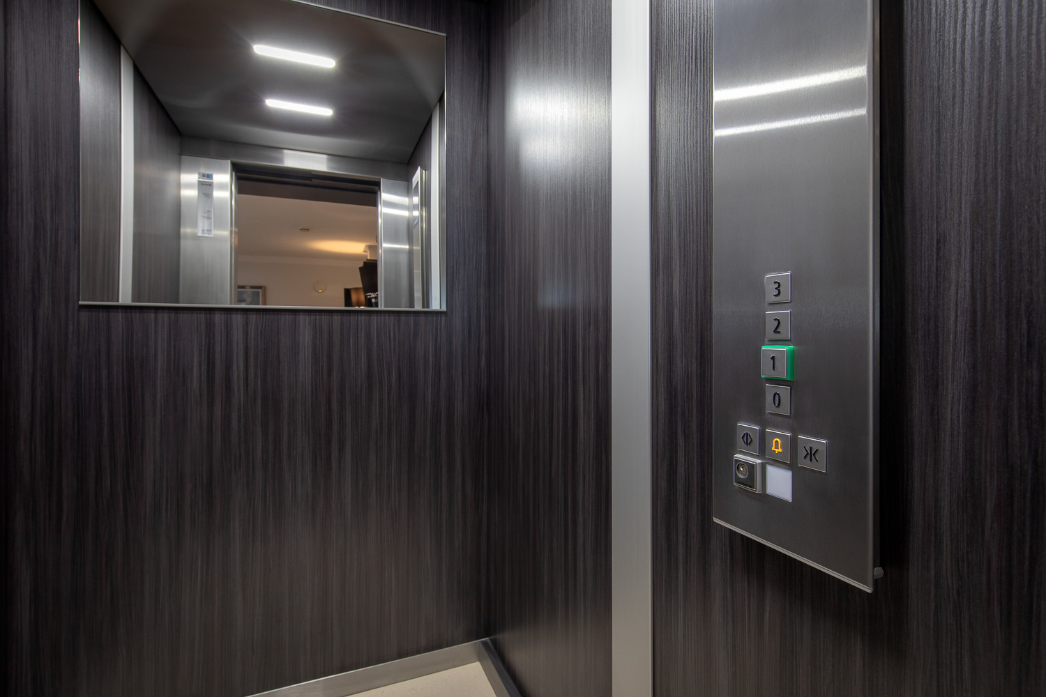 Neu im Betrieb ist seit November 2018 auch der Aufzug: ein lifeLine von Haushahn. Die Tage als Testgäste sind mittlerweile vorüber, die Arbeiten im ehemaligen Quellenhof abgeschlossen. Die vier Etagen mit ihren 19 Zimmern entsprechen nun dem modernen Stil der kleinen, aber feinen Hotelkette der Eichlers –„Luxstay“ –, deren Häuser außerdem noch in Friedberg, Bad Nauheim und in der Nähe von Berlin zu finden sind. Schwarze Holzverkleidungen, dunkelbraunes Parkett, Couches und Stehlampen dominieren heute die neue Hotellobby in Karben.