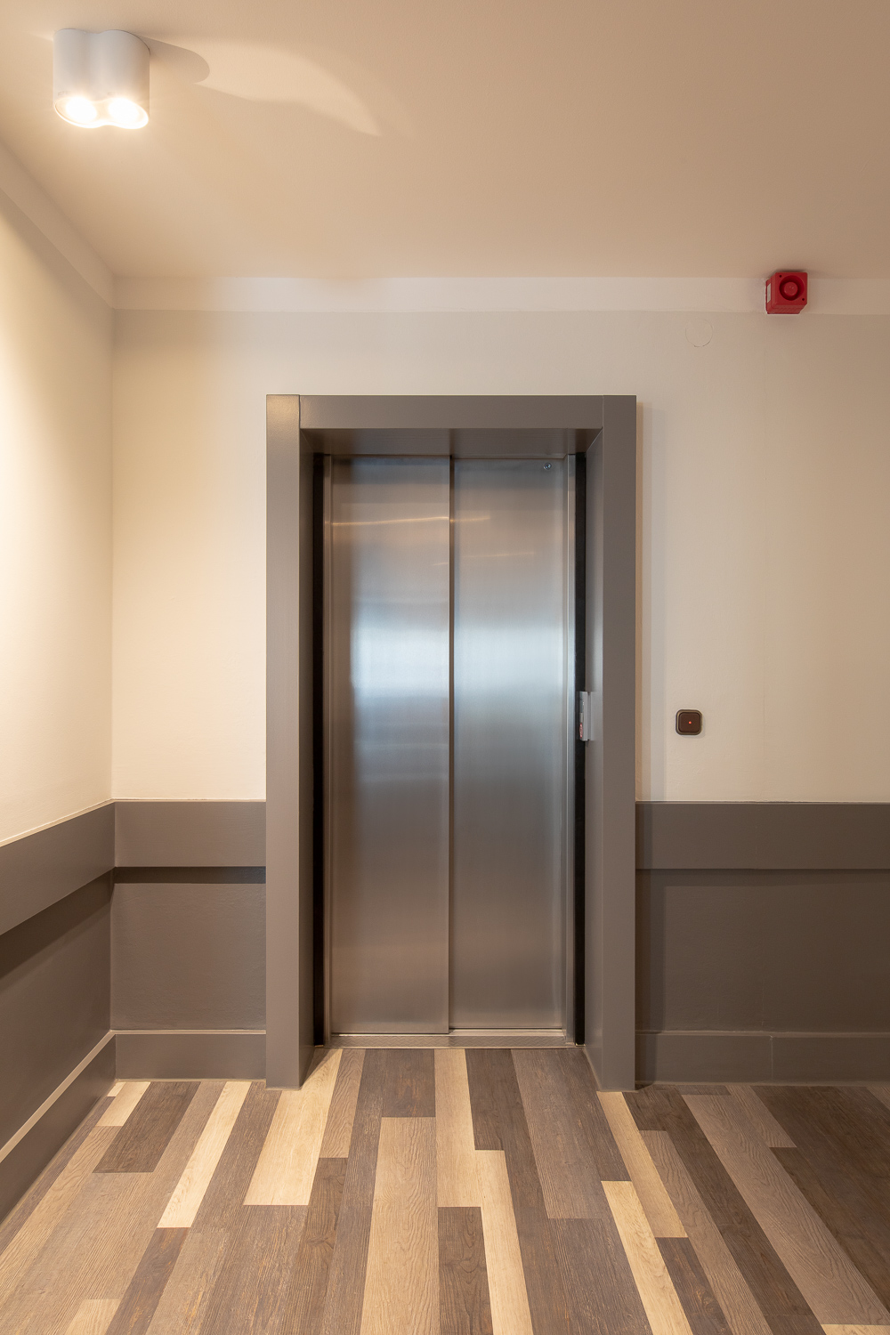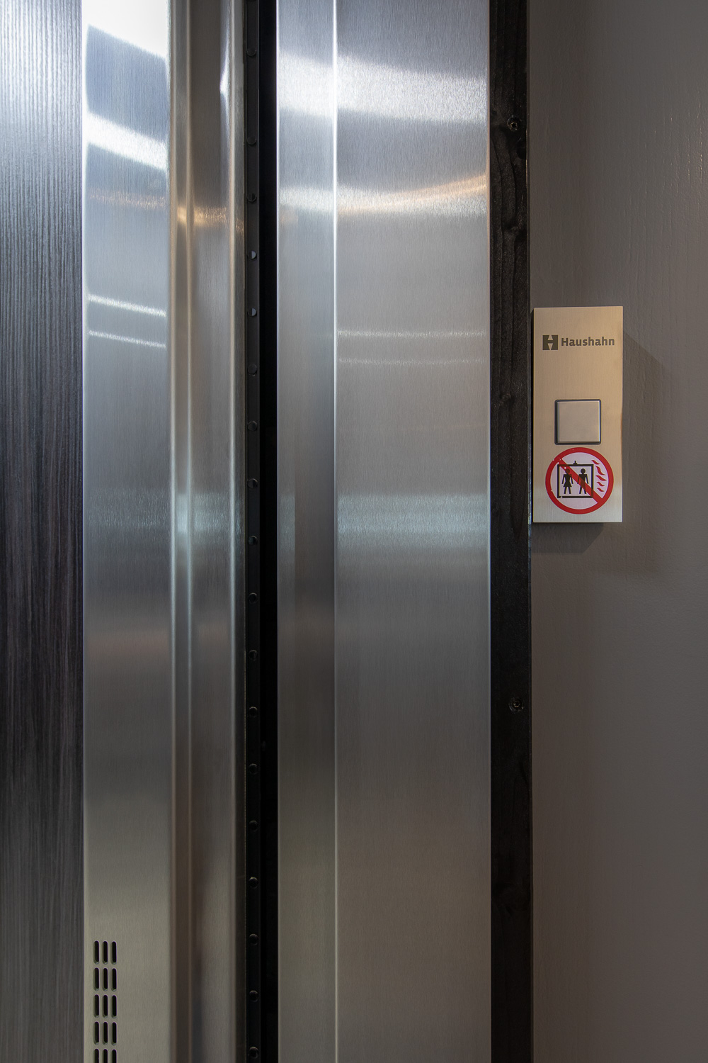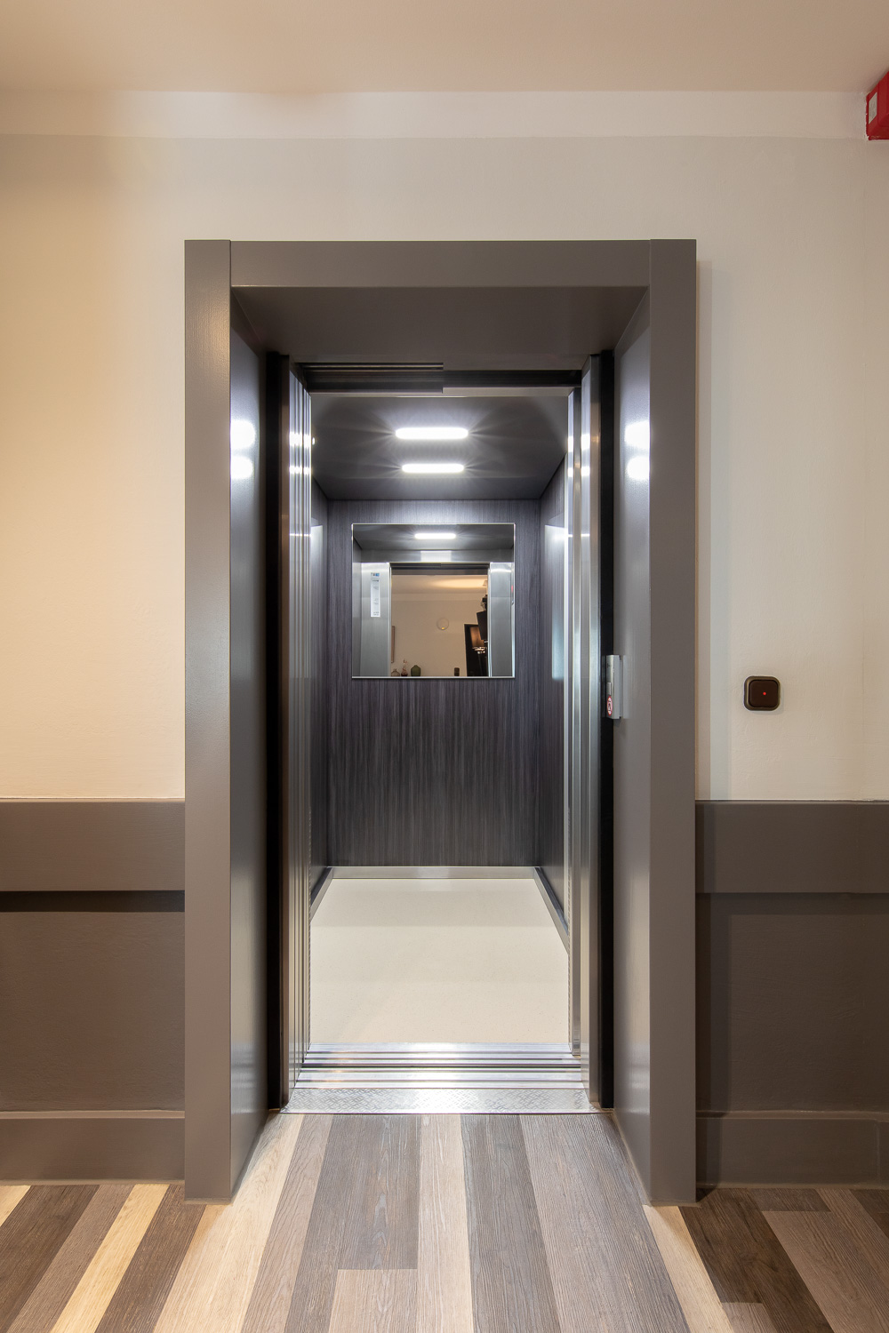 Neu im Betrieb ist seit November 2018 auch der Aufzug: ein lifeLine von Haushahn. Die Tage als Testgäste sind mittlerweile vorüber, die Arbeiten im ehemaligen Quellenhof abgeschlossen. Die vier Etagen mit ihren 19 Zimmern entsprechen nun dem modernen Stil der kleinen, aber feinen Hotelkette der Eichlers –„Luxstay“ –, deren Häuser außerdem noch in Friedberg, Bad Nauheim und in der Nähe von Berlin zu finden sind. Schwarze Holzverkleidungen, dunkelbraunes Parkett, Couches und Stehlampen dominieren heute die neue Hotellobby in Karben.