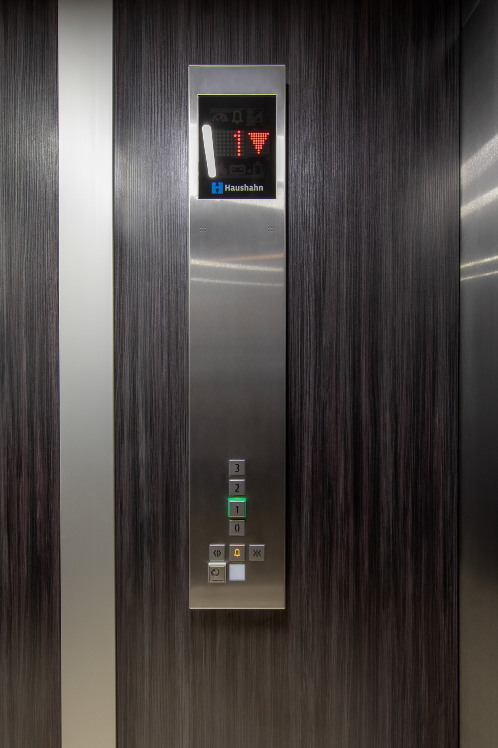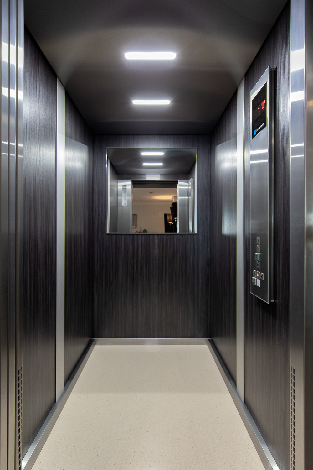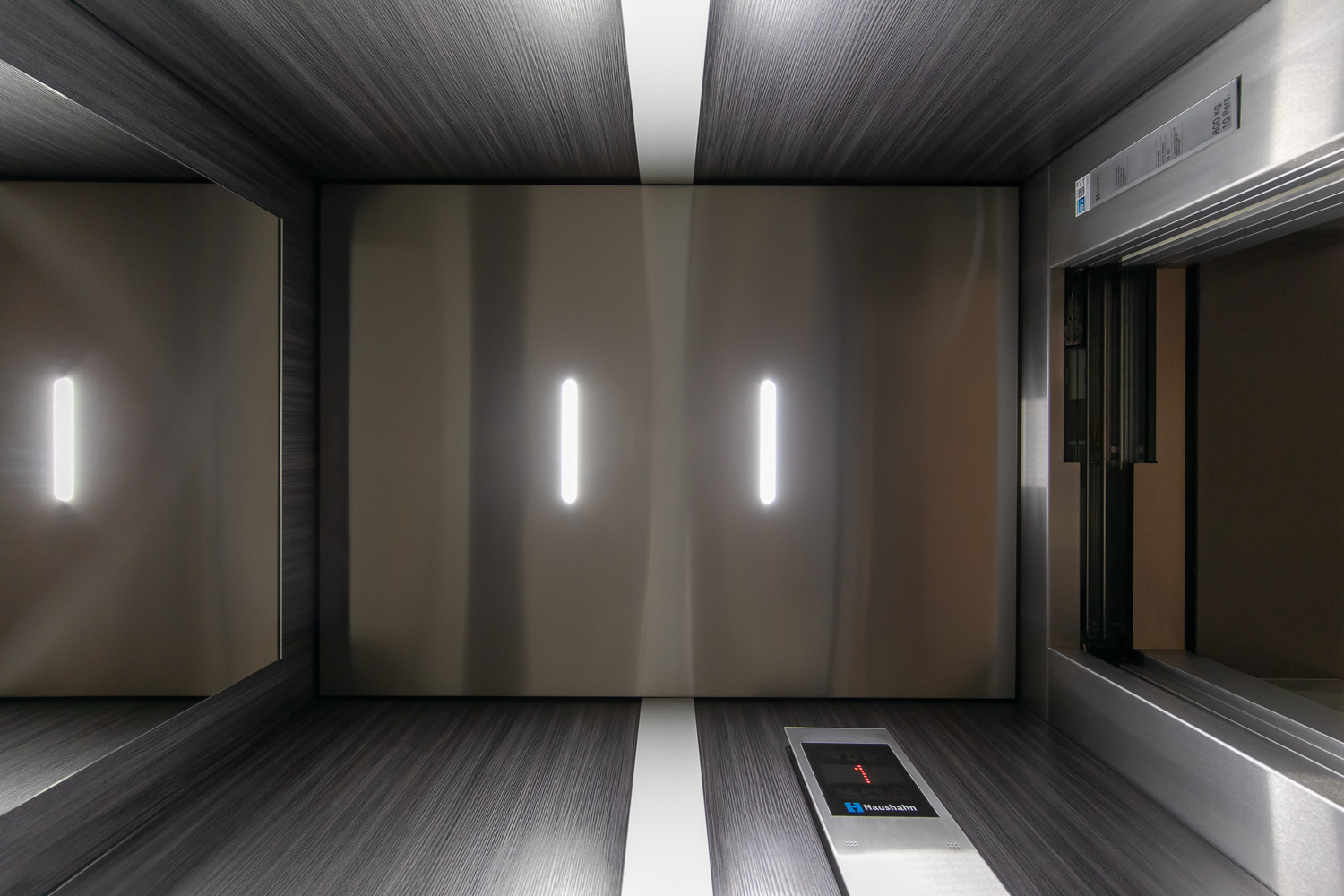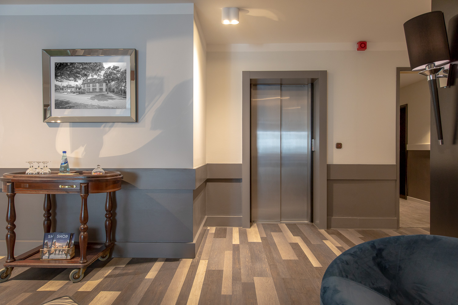 Neu im Betrieb ist seit November 2018 auch der Aufzug: ein lifeLine von Haushahn. Die Tage als Testgäste sind mittlerweile vorüber, die Arbeiten im ehemaligen Quellenhof abgeschlossen. Die vier Etagen mit ihren 19 Zimmern entsprechen nun dem modernen Stil der kleinen, aber feinen Hotelkette der Eichlers –„Luxstay“ –, deren Häuser außerdem noch in Friedberg, Bad Nauheim und in der Nähe von Berlin zu finden sind. Schwarze Holzverkleidungen, dunkelbraunes Parkett, Couches und Stehlampen dominieren heute die neue Hotellobby in Karben.