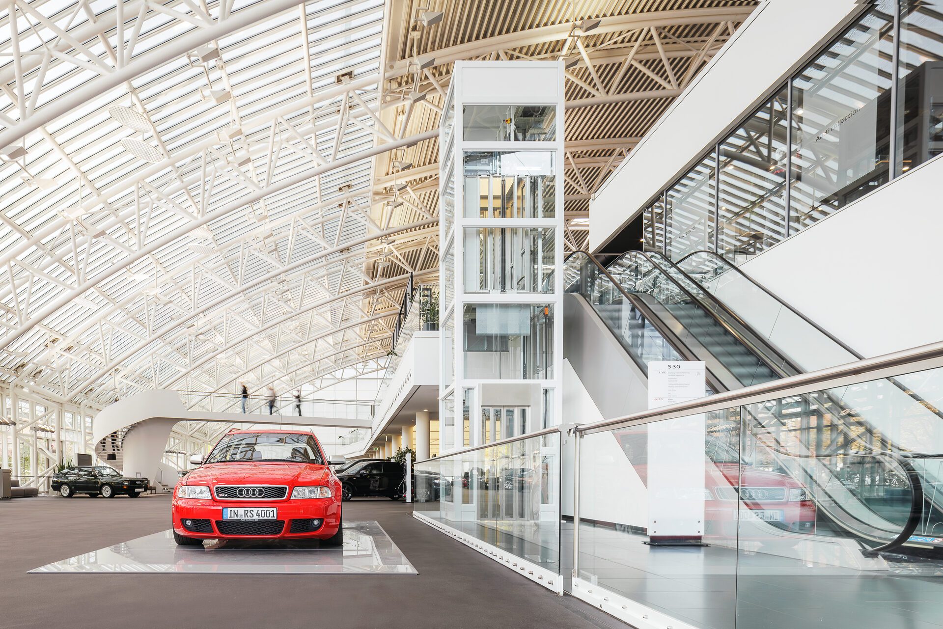 Mit einer Glasschachtkonstruktion für Gruppenaufzüge, die aus schwarzen Stahlträgern konstruiert worden ist, setzt Haushahn bereits am Terminalhaupteingang auf ein architektonisches Highlight. Dabei verlangten die vier Glasschachtgerüste mit einer Höhe von 17 Metern und einem Gewicht von 9,5 Tonnen jeweils nach Speziallösungen. Für den Transport aus dem Schwarzwald beauftragte Haushahn daher einen Schwersondertransport samt Sonderwegen und -abfahrten. Mit einem 500-Tonnen-Schwerlastkran ließ sich die Stahlkonstruktion schließlich vor Ort in die Baugrube heben.